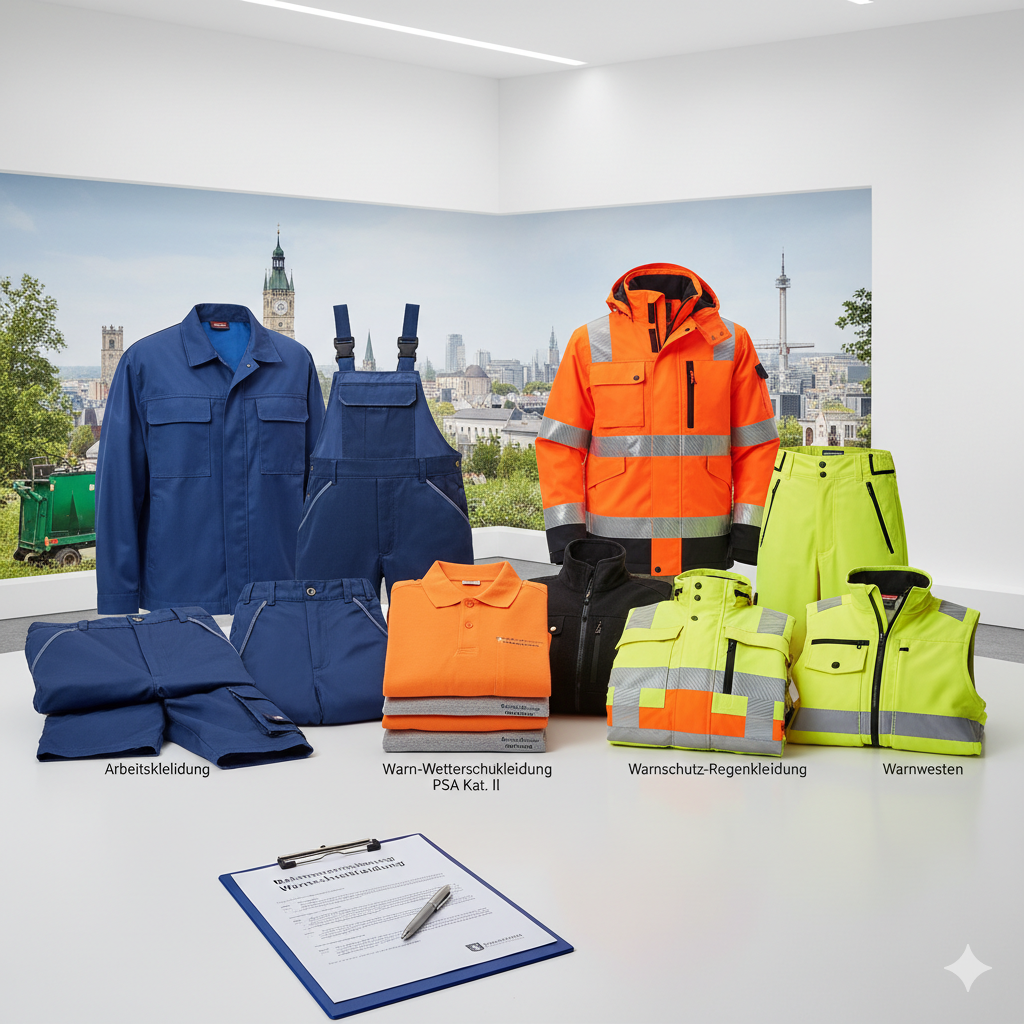 Fornecimento de vestuário de proteção e laboral para o Departamento de Construção e Jardinagem (BauR Gartenbau), dividido em 5 lotes. Inclui casacos, calças, t-shirts, polos e vestuário de alta visibilidade/impermeável.